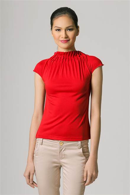 Cap Sleeves Blouse With Pleated Neckline Detail In Jersey Fabric.